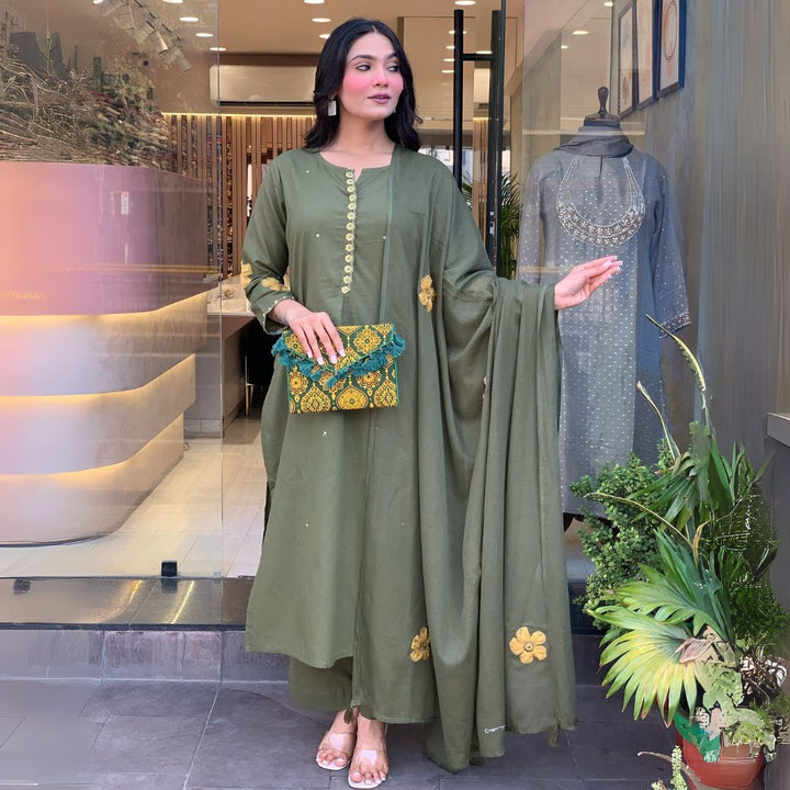 Step into effortless grace with our Gulbano Olive Green Kurta Set, crafted in luxurious Chanderi Silk. This elegant ensemble features a straight-fit kurta adorned with minimal floral embroidery and delicate mirror buttons, paired with matching silk pants for all-day comfort. The highlight is the embroidered Chanderi dupatta with striking floral appliqué motifs that add a festive charm.